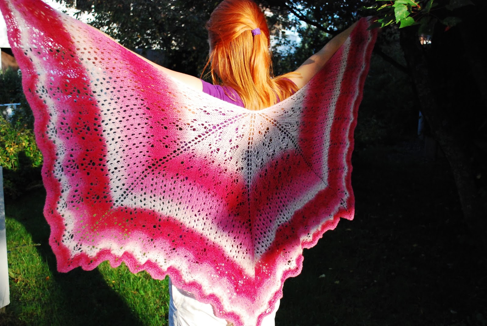 Täytyy tunnustaa, ettei huivi ollut niin suuritöinen, mutta oma aikani sen neulomiseen oli kortilla. Olin ehtinyt neuloa huivia yli viikon, kunnes minulla alkoi koulu. Siinä hötäkässä ei riittänyt ainakaan keskittymiskyky edes yksinkertaisempaan pitsin tekemiseen, kun kotona oleva aika meni vain infoähkystä toipuessa. Osasin lopulta kääntää hankaluudet voitoksi ja otin huivin mukaan tylsiin infotilaisuuksiin, jolloin sainkin työni etenemään oikein näppärästi.